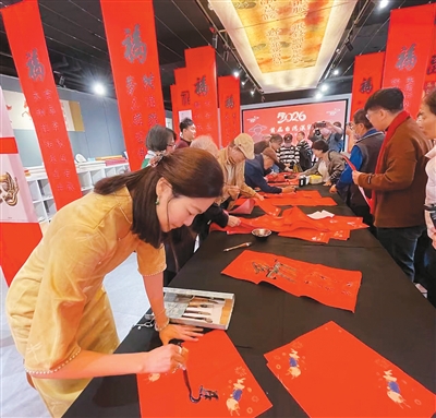2月6日,在首届“台湾汉纸两岸艺术家春联、年画、漫画展”现场,参展艺术家书写春联。